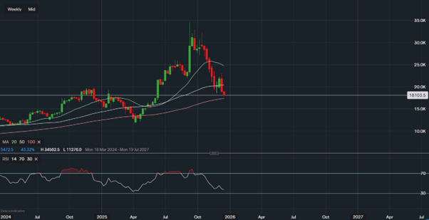 Looking at the weekly timeframe, Oracle’s RSI stands at 37 and continues to decline rapidly. However, a notable technical support level exists at the 100-week moving average, which may act as a key price floor and help prevent further downside momentum.